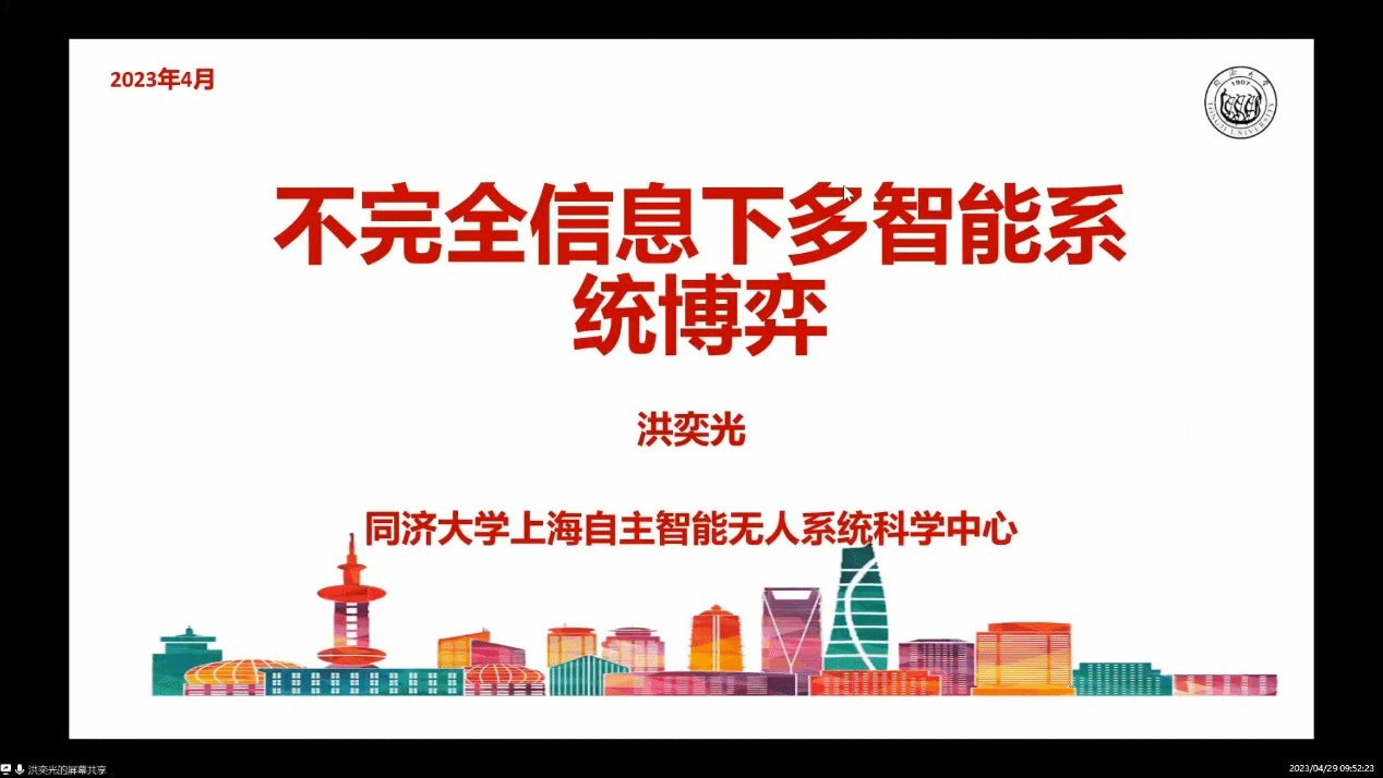 董希旺教授作“集群系统协同控制理论及在飞行器集群中的应用”的学术报告;洪奕光教授作“不完全信息下多智能体系统博弈”的学术报告;王燕舞教授作“直流微网多源协同供电控制”的学术报告;唐漾教授作“智能无人系统感知与决策”的学术报告。