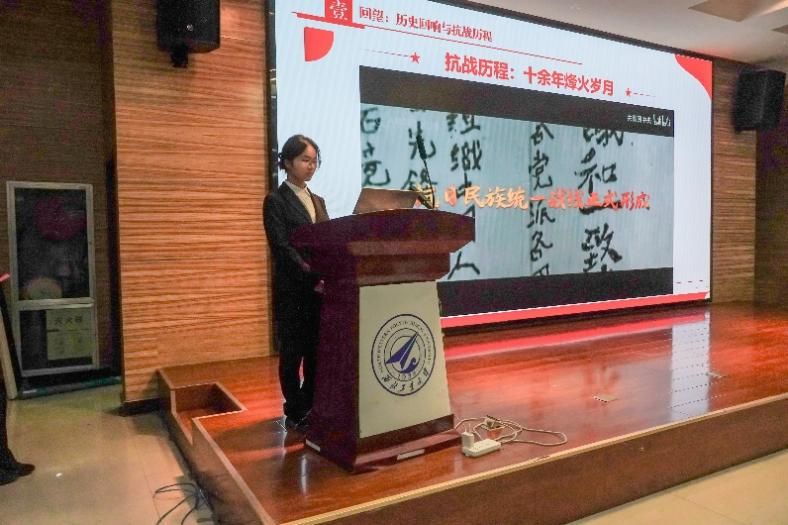 首先上场的是张义慧同学,她将那段烽火岁月中民族脊梁的挺立与进步力量的生长展现得淋漓尽致。她深入挖掘了苦难辉煌中孕育的精神星火——在存亡绝续关头迸发的坚韧勇毅、众志成城,以及进步力量对光明的不懈追寻,正是穿越时空的精神灯塔。